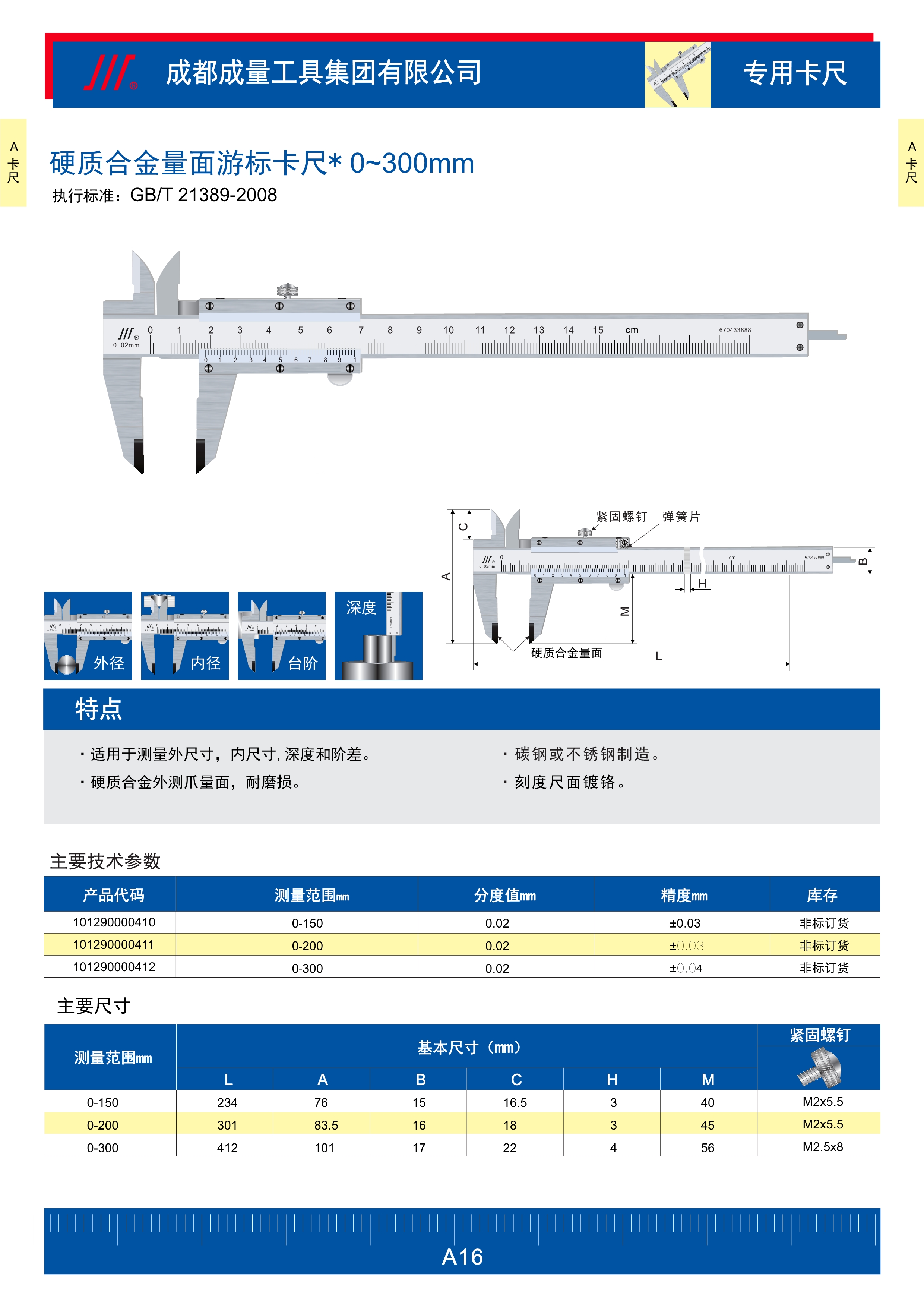 成量硬质合金量面游标卡尺 执行标准: GB/T 21389-2008-卡尺-成量-成都成量工具有限公司,成量,成量工具,卡尺,百分表,千分尺,量具,刃具