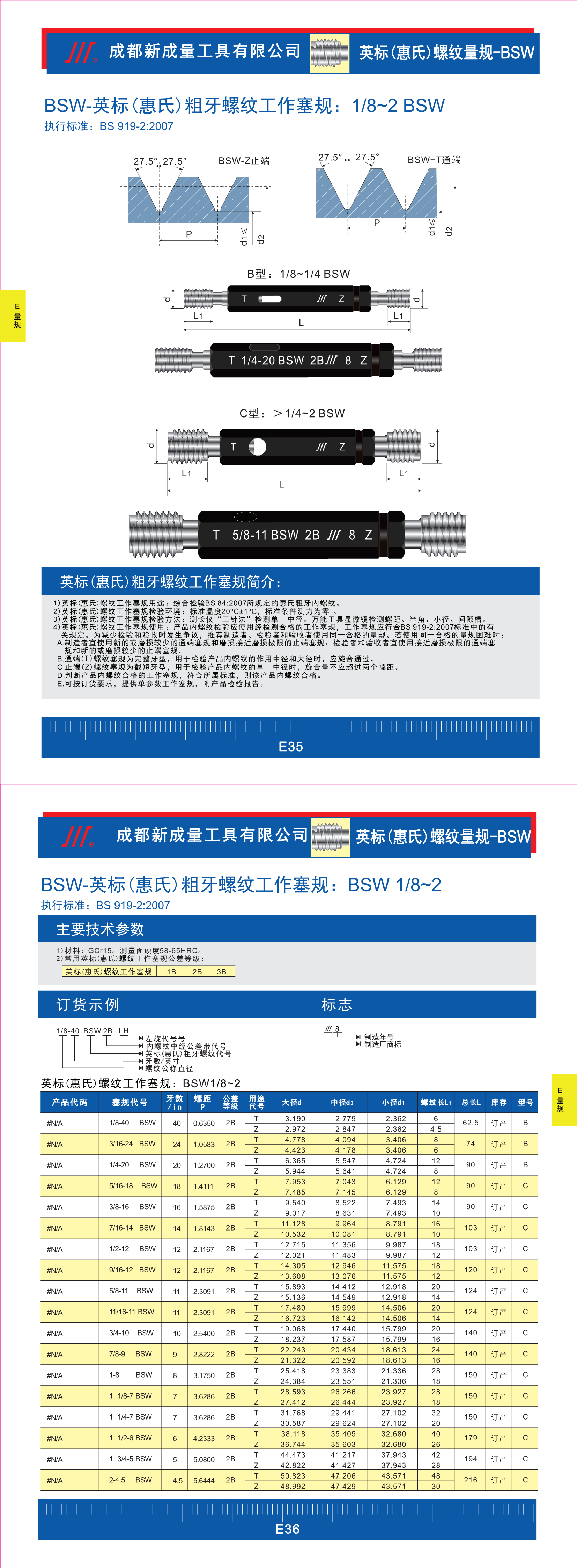 BSW-英标(惠氏)粗牙工作塞规执行标准: BS 919-2:2007
