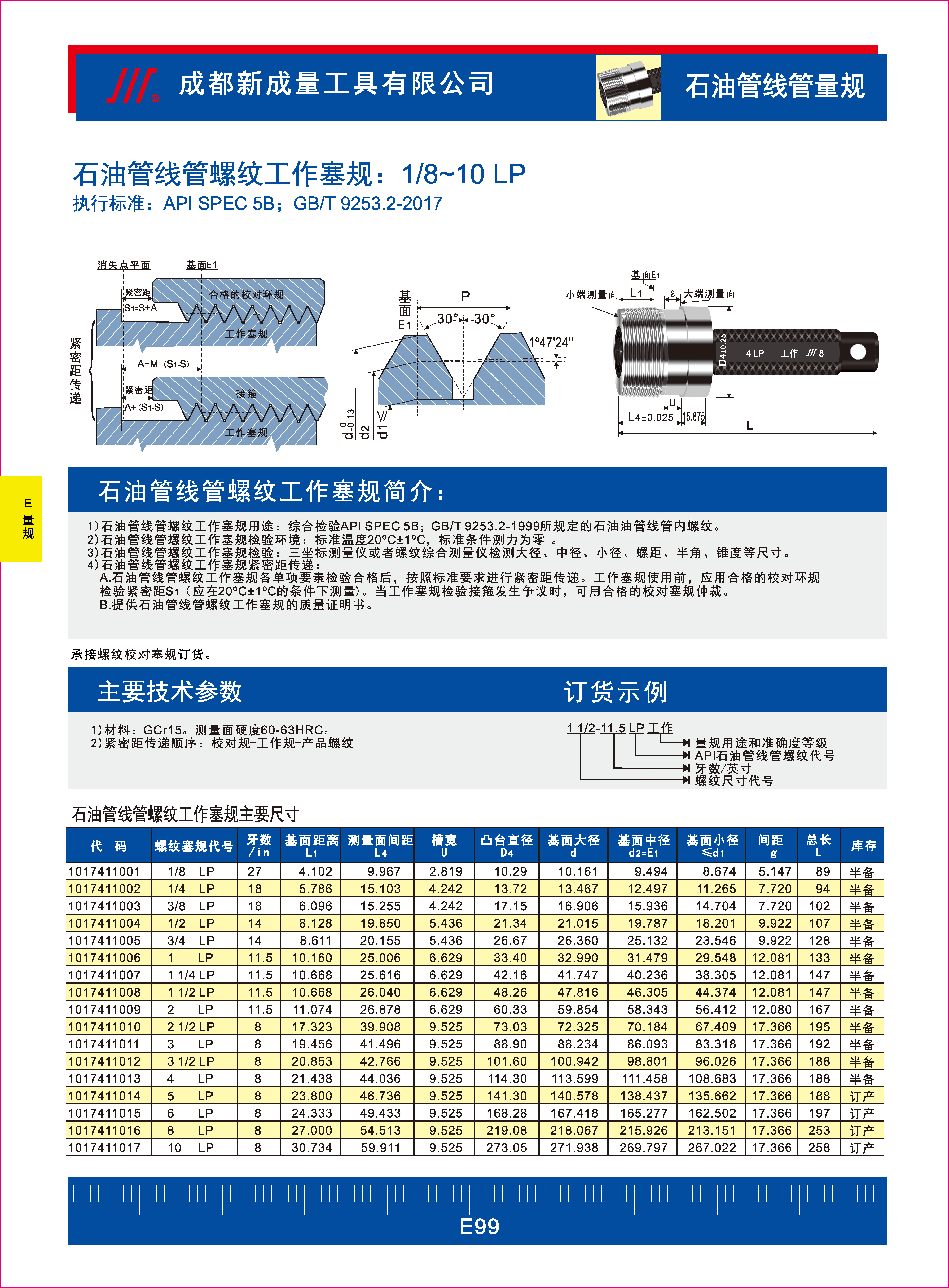 石油管线管螺纹工作塞规执行标准: API SPEC 5B;GB/T 9253.2